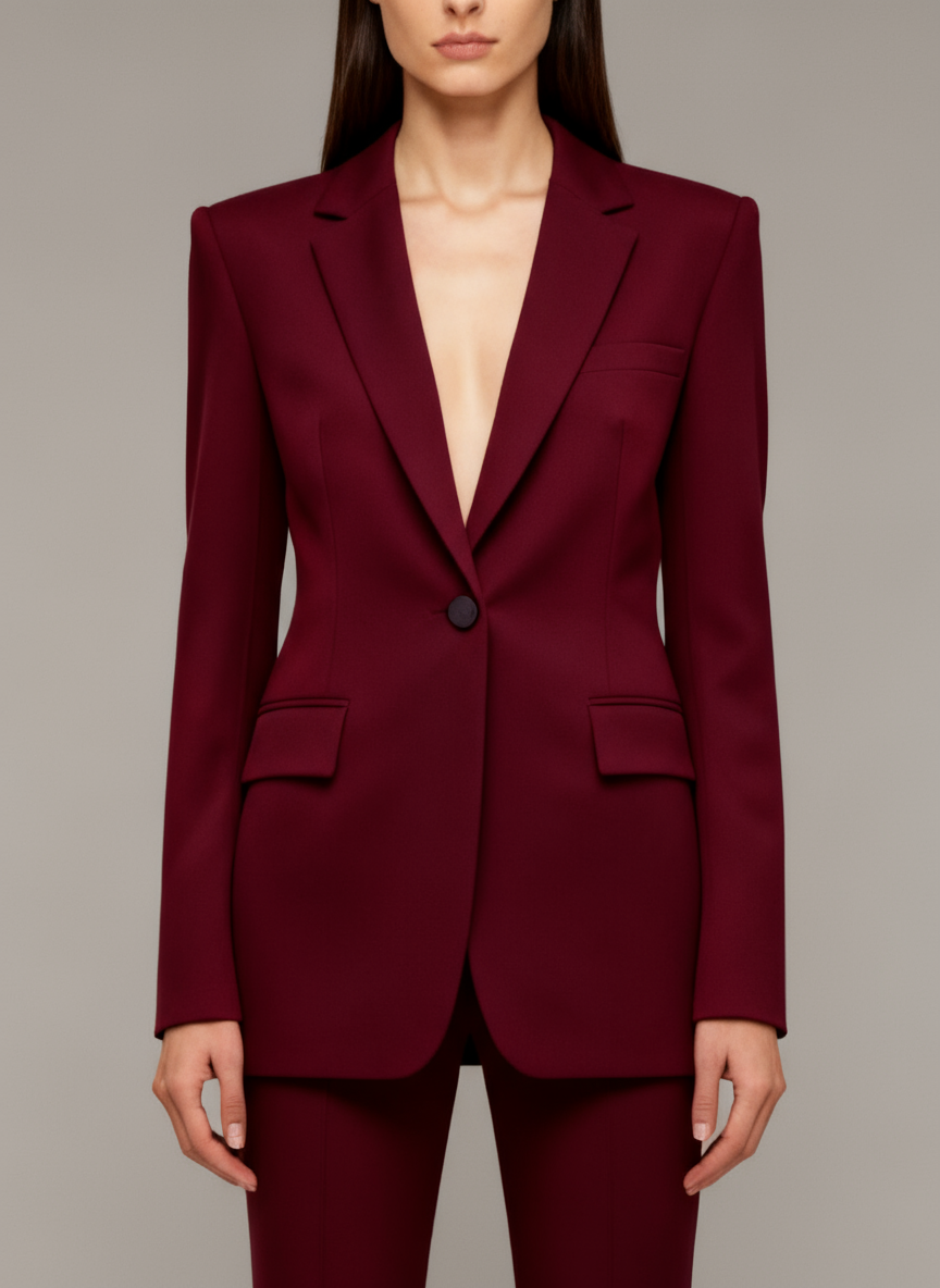Women’s Burgundy Tailored Two-Piece Suit – Sculpted Blazer and Flared Trousers Set