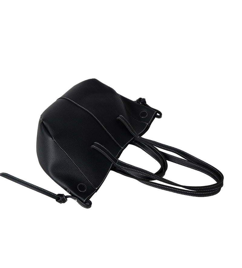 Design: Structured trapeze tote with pebbled finish, contrast stitching, dual top handles and longer shoulder straps, open-top silhouette